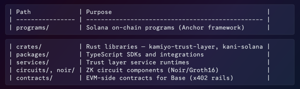 The KAMIYO monorepo on GitHub is a serious engineering effort spanning multiple layers: